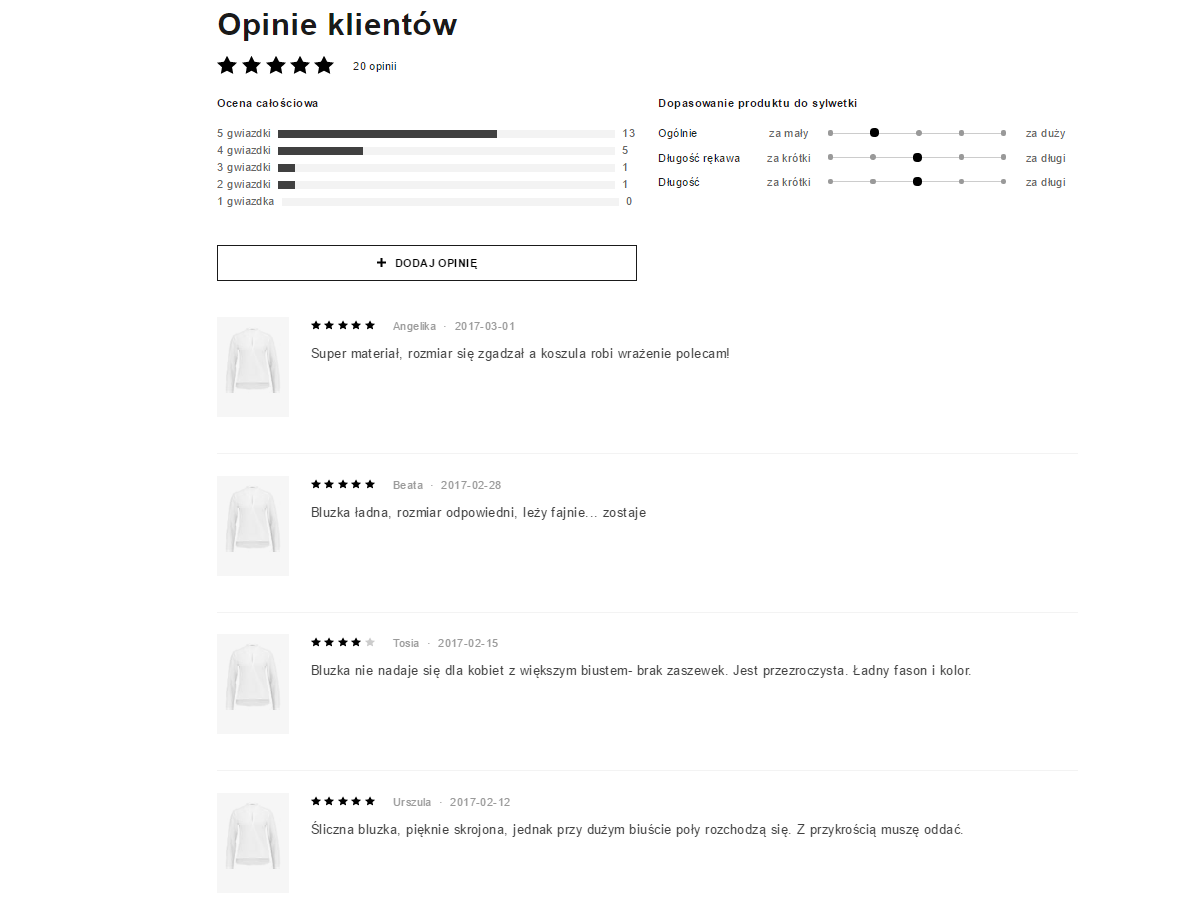 Все продавцы хвалят свою продукцию, но это не всегда надежно для покупателей. Намного лучше, если положительные качества продуктов подтверждаются людьми, которые купили продукт. Между тем, многие продавцы по-прежнему не предоставляют возможность размещения комментариев покупателей непосредственно на сайте магазина. В этом отношении стоит привести пример из популярных магазинов, таких как zalando.pl, где комментарии часто занимают больше места, чем описание продукта. Возможность вставки мнений, а также оценки продукта, также можно найти в лучших, по мнению Opineo.pl, польский интернет-магазин, или Morele.net 1.